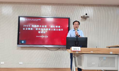 刘晓冬在讲话中指出,本次培训是学院精心谋划的导师队伍建设 “强基工程”,旨在通过校级政策引领与院级实践培训的深度融合,打造一支师德高尚、业务精湛、育人有方的导师队伍。他强调,导师肩负着培养公共卫生领域高层次人才的重任,要求全体导师以此次培训为契机,将 “为党育人、为国育才” 的使命扛在肩上,以更专业的素养投入育人工作。