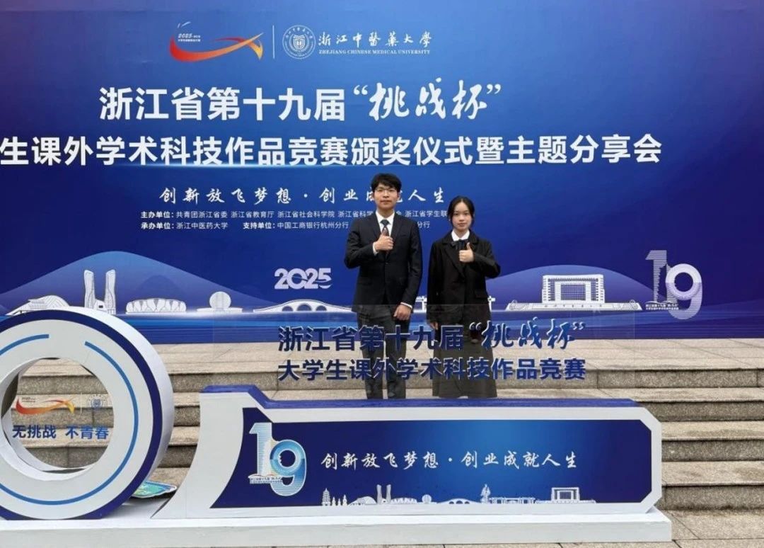 5月18日,浙江省第十九届“挑战杯”大学生课外学术科技作品竞赛在杭州落下帷幕。好色视频 推报的“荧认而检——非免疫型四环素残留快速检测荧光试纸的研发”和“辐射代谢与动脉健康——解锁中性粒细胞基因表达的防护密码”项目,获得金奖和铜奖。