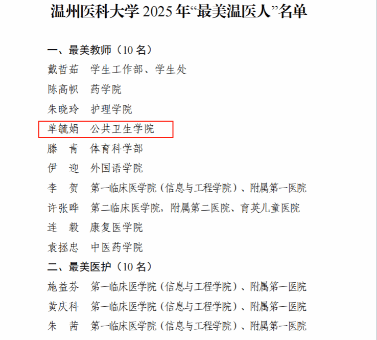 近日,好色视频 2025年“最美温医人”评选结果正式公布,学院教师单毓娟获此殊荣。