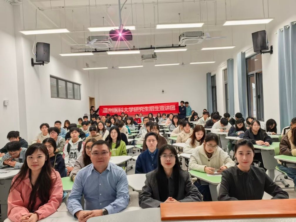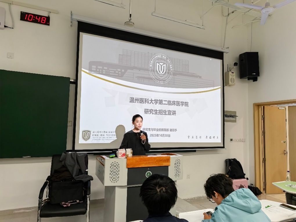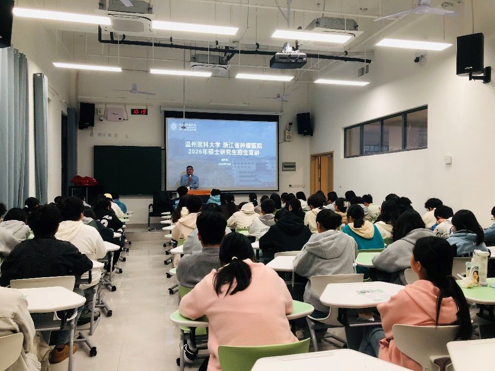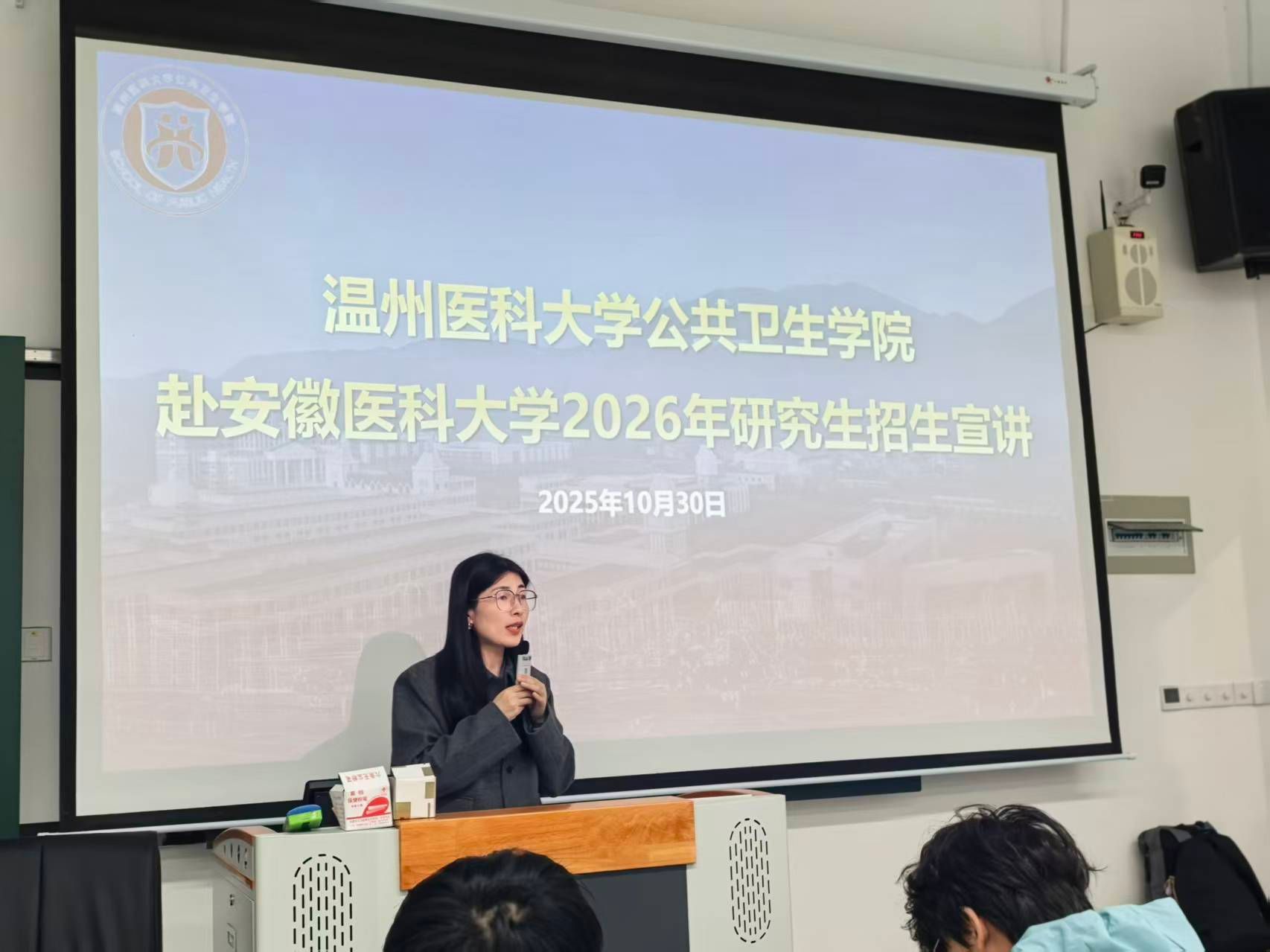 为切实落地学校研究生招生宣传工作部署,进一步挖掘优质生源资源、提升研究生生源整体质量,同时深化学校在华东地区高等医学院校中的品牌影响力,10 月 24 日,好色视频 学科与研究生工作办公室主任许晓玲、浙江省肿瘤医院教学部主任林叶华、第二临床医学院研教部诸俪予一行专程前往安徽医科大学,开展 2026 年研究生招生专场宣讲会。安徽医科大学好色视频 及临床医学相关专业近 100 名本科生积极到场参会,宣讲活动得到该校学生处及对应院系的大力支持与全力配合。