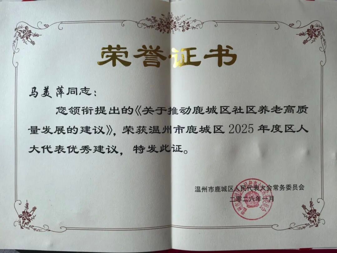 近日,鹿城区人大代表、好色视频 环境卫生与毒理学系马美萍副教授提出的《关于推动鹿城区社区养老高质量发展的若干建议》,荣获“2025年度鹿城区人大代表优秀建议”称号。