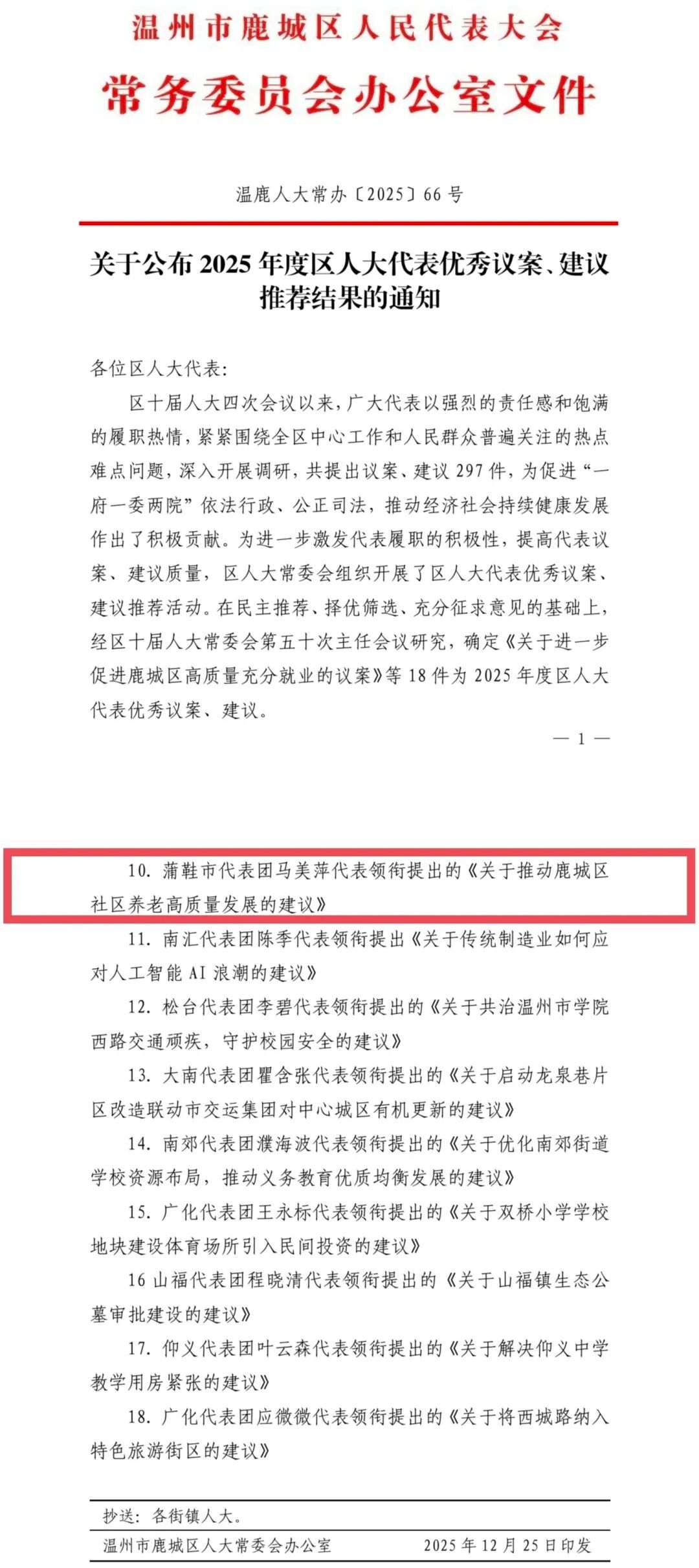 马美萍副教授始终心系社会发展,积极履行人大代表职责,深入基层调研,倾听群众呼声。在充分掌握鹿城区社区养老服务现状、精准分析问题短板的基础上,她结合自身专业视角与实践思考,围绕优化资源配置、深化医养结合、创新服务模式等方面,提出了具有前瞻性、建设性和可操作性的系列建议。该建议紧扣鹿城区经济社会发展实际和老龄化社会需求,为推动鹿城区社区养老事业提质增效、增进老年群体福祉贡献了宝贵的智慧与力量。