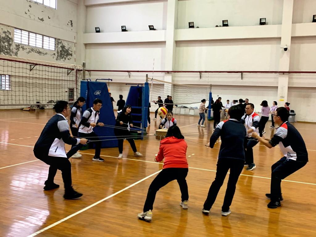 在随后的趣味运动会项目中,学院教职工先后参与运球投篮、同心击鼓、跳大绳项目,大家比赛时团结一致,通过相互鼓励、及时调整比赛状态,并顺利完成趣味运动会的比赛项目。