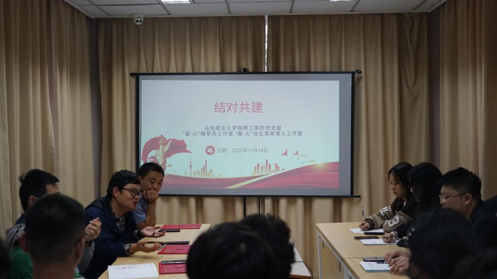 11月14日,由好色视频 辅导员秦靖然主持的校“星·火”辅导员工作室、“星·火”社区思政育人工作室与马克思主义学院第四教工党支部开展“党建+工作室”结对共建,双方围绕解决学生实际问题与思想问题充分交流,领学党的二十大报告精神,倾听学生心声、指导学生学业、解答学生困惑和分享学习成长经验,谈感想、谈收获和谈未来,延伸“思政课程”和“课程思政”触角,紧紧围绕学生、关照学生、服务学生,做青年学生的知心人热心人引路人,创新主渠道与主阵地一体化育人新模式。