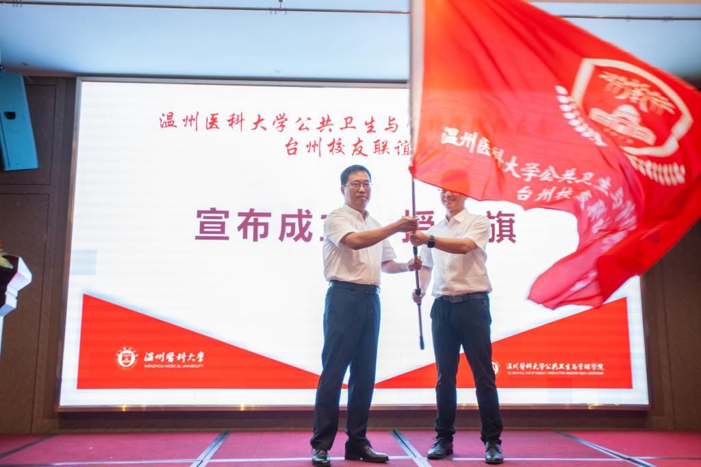 公共卫生与管理学院书记马洪君宣布公共卫生与管理学院校友会台州校友联谊会正式成立,并为联谊会会长赵剑授旗。现场嘉宾为联谊会会长、副会长、秘书长、理事们颁发聘书。