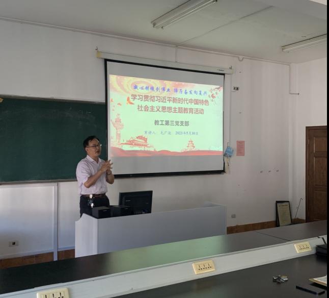 随后,党支部书记毛广运继续开展“学习贯彻习近平新时代中国特色社会主义思想主题教育”活动,其围绕新思想科学体系、新思想的运用、关于解决“三新一高”、关于解决“大党独有难题”、大兴调查研究之风等方面进行专题讲解。在讲解过程中,毛广运要求全体党员教师在思想政治、调查研究、专业学习、廉洁奉公等方面严格要求自己,做到学思用的贯通、知信行的有机统一。