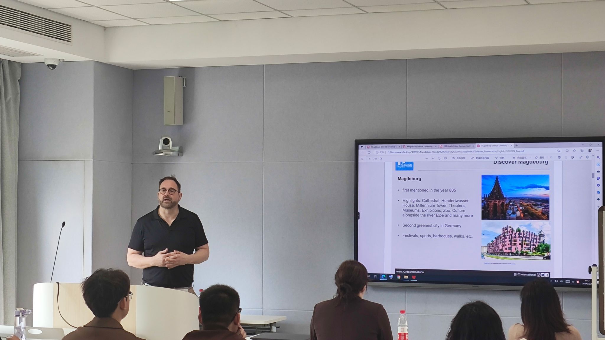 Kateryna Fuks教授以“Environment and Health:Teaching and research at the Magdeburg-Stendal University of Applied Sciences”为题,围绕空气污染和心血管疾病、城市绿色基础设施与卫生情况、教学活动3大模块,系统性阐释了教授对环境与健康领域的独到见解。讲座结束后,Ralf Lottmann教授与Kateryna Fuks教授同学院师生进行了深入的互动交流。