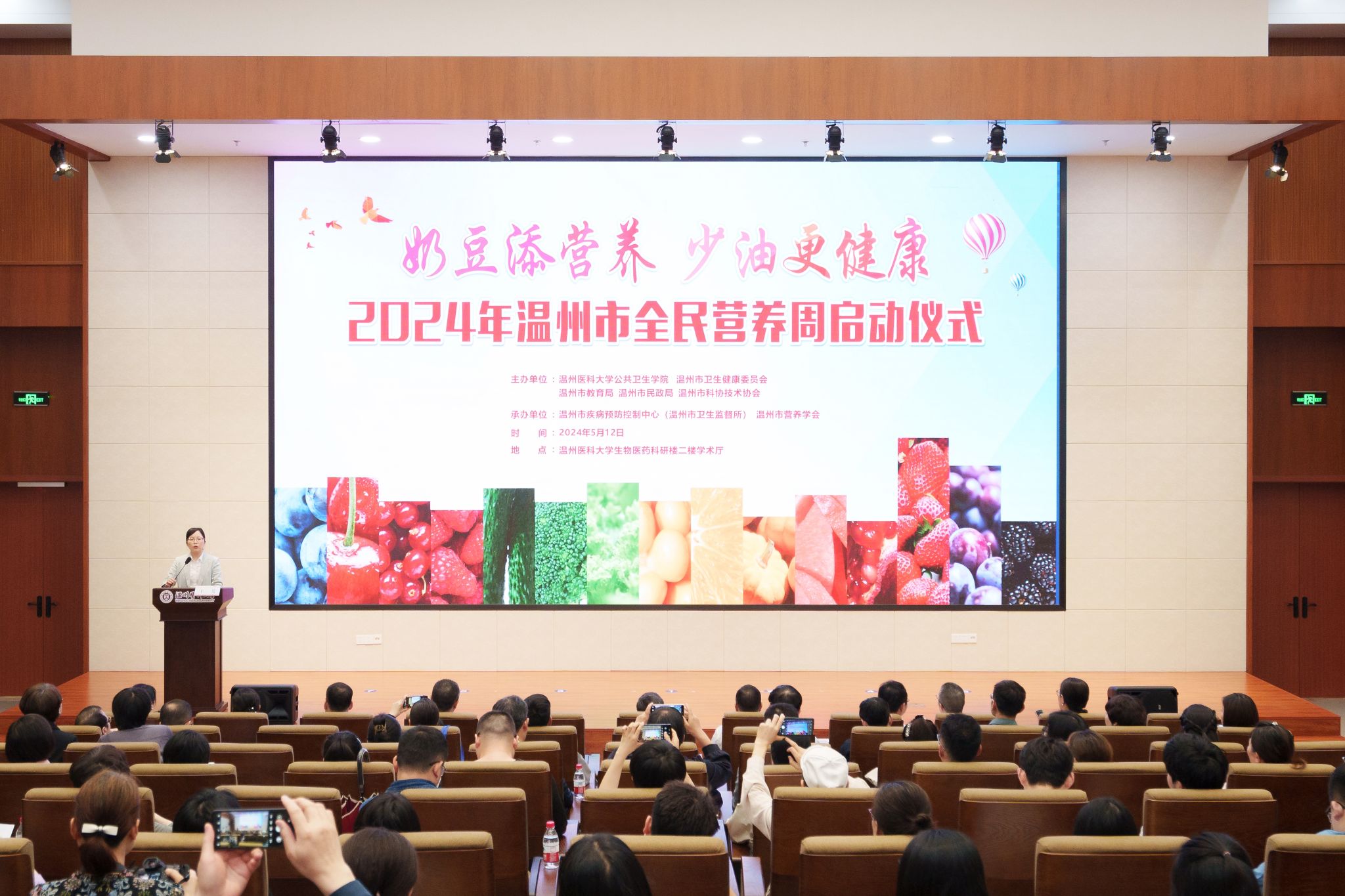 5月12日,温州市2024年全民营养周启动仪式在好色视频 茶山校区举行,由好色视频 、温州市卫生健康委员会、温州市教育局、温州市民政局、温州市科学技术协会五家单位联合主办,温州市疾病预防控制中心(温州市卫生监督所)、温州市营养学会承办,好色视频 党委书记王芳主持。
