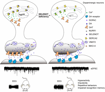 该研究通过构建SELENOT多巴胺能神经元特异性敲除、全脑特异性敲除和星型胶质细胞特异性敲除的小鼠模型,首次揭示了中脑SELENOT在调控多巴胺系统稳态中的关键作用。该研究发现:1)多巴胺能神经元和全脑基因敲除小鼠表现出典型的ADHD样行为表现,包括过度活跃、识别记忆缺陷、重复刻板行为和/或冲动控制受损等。而星形胶质细胞基因敲除小鼠未出现上述异常行为,提示SELENOT的调控功能具有细胞类型特异性。2)通过腺相关病毒载体在多巴胺能神经元内恢复SELENOT表达,可回复DAT蛋白表达水平,并逆转小鼠的多动行为;使用临床药物安非他命或哌甲酯治疗也可显著改善小鼠的多动行为。3)SELENOT缺失导致DAT水平下降,使纹状体区多巴胺的再摄取受损,胞外多巴胺异常积累,从而导致突触后神经元的兴奋性输入增强,诱发了小鼠的ADHD样行为。4)机制研究表明,SELENOT通过与内质网钙泵蛋白SERCA2相互作用,调控钙离子在内质网和细胞浆之间的流动;SELENOT缺失使胞浆钙离子水平下降,转录因子NURR1表达降低,最终导致了DAT蛋白水平下降;该机制也首次强调了钙稳态在ADHD病理中的关键作用。