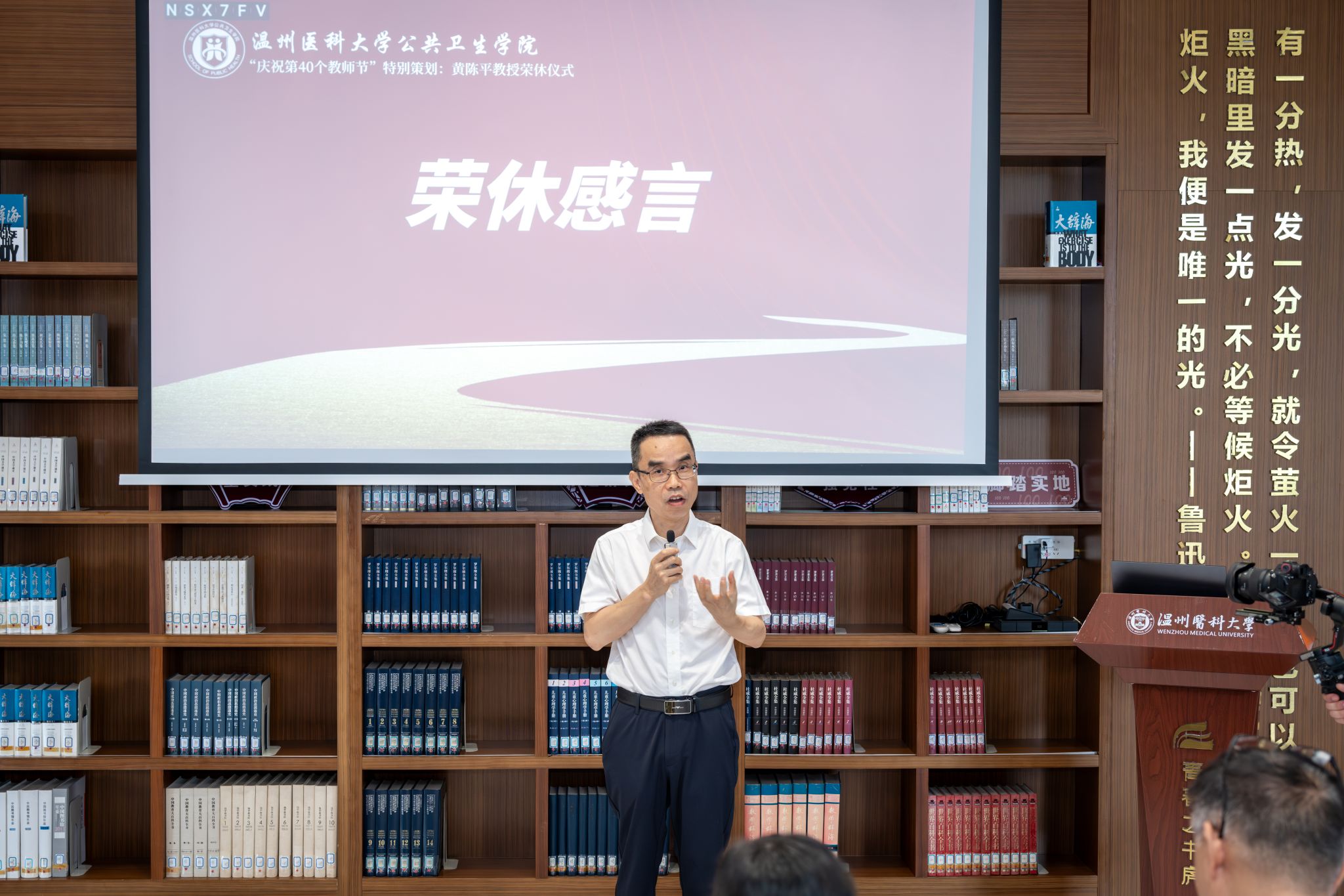 “感谢学院为我举办隆重的荣休仪式,感谢大家在百忙之中来抽空见证这一时刻,我的几个学生特意从外地赶来,非常有心。温医为我个人的提高和发展提供了很大的平台。不管是一名普通教师,还是当院长,实际上面临着很多困难。非常感谢一路上许许多多的老师和领导给与的支持,在这个发展过程当中,我真的只是一分子,在某些方面,我是一个组织者和参与者,更多的贡献是大家的。”最后,黄教授发表荣休感言。“在温医这么多年,很多同事、学生不是亲人,胜似是亲人。不管温医大爱不爱我,反正我爱上了!祝愿学院在大家的努力下,事业获得更大地发展。