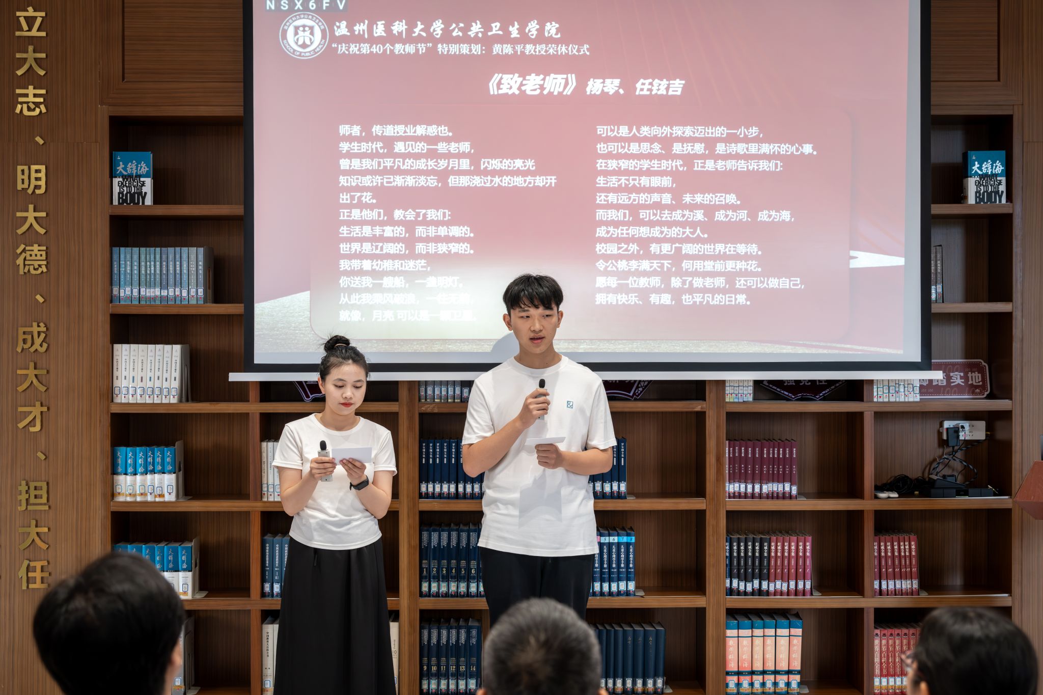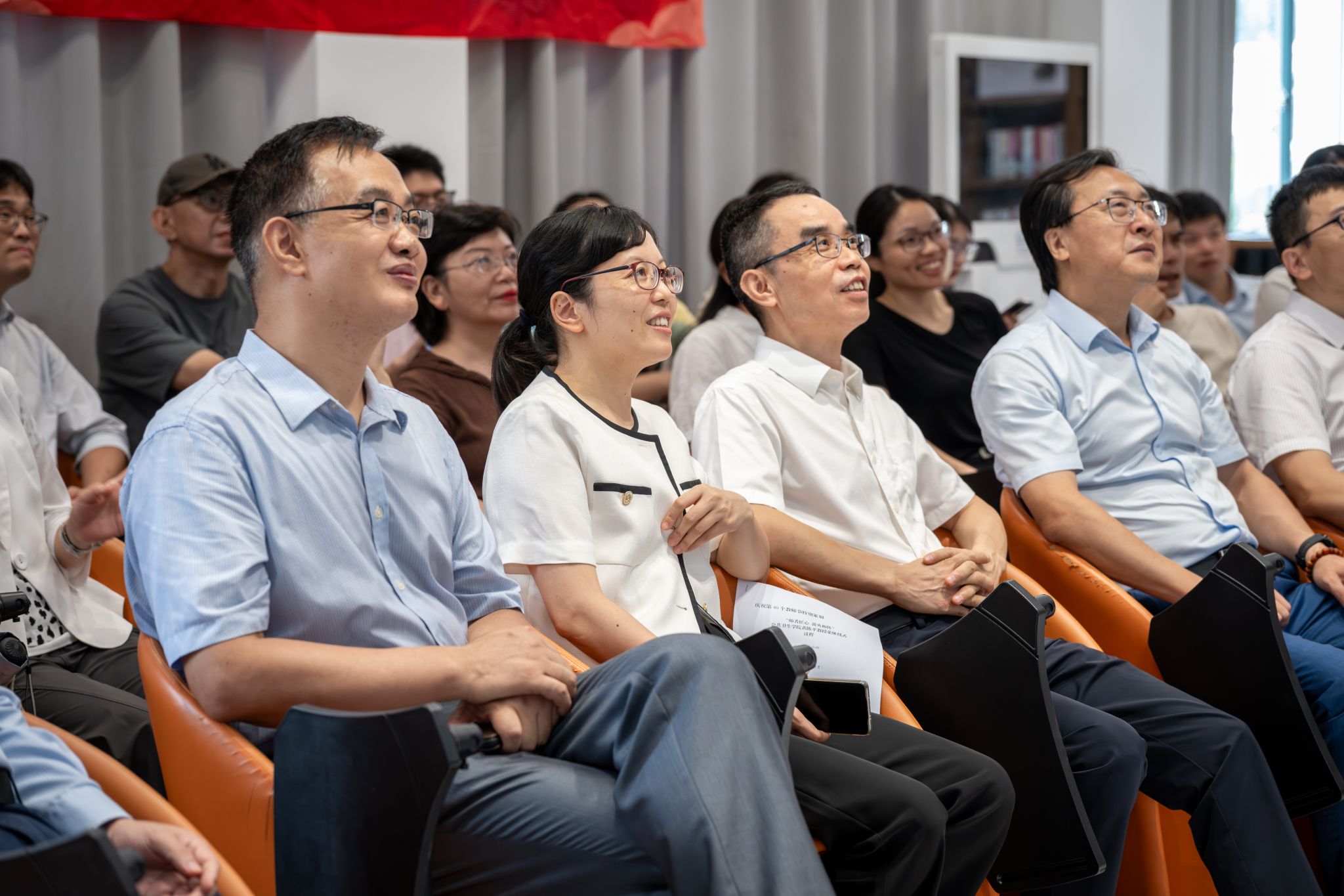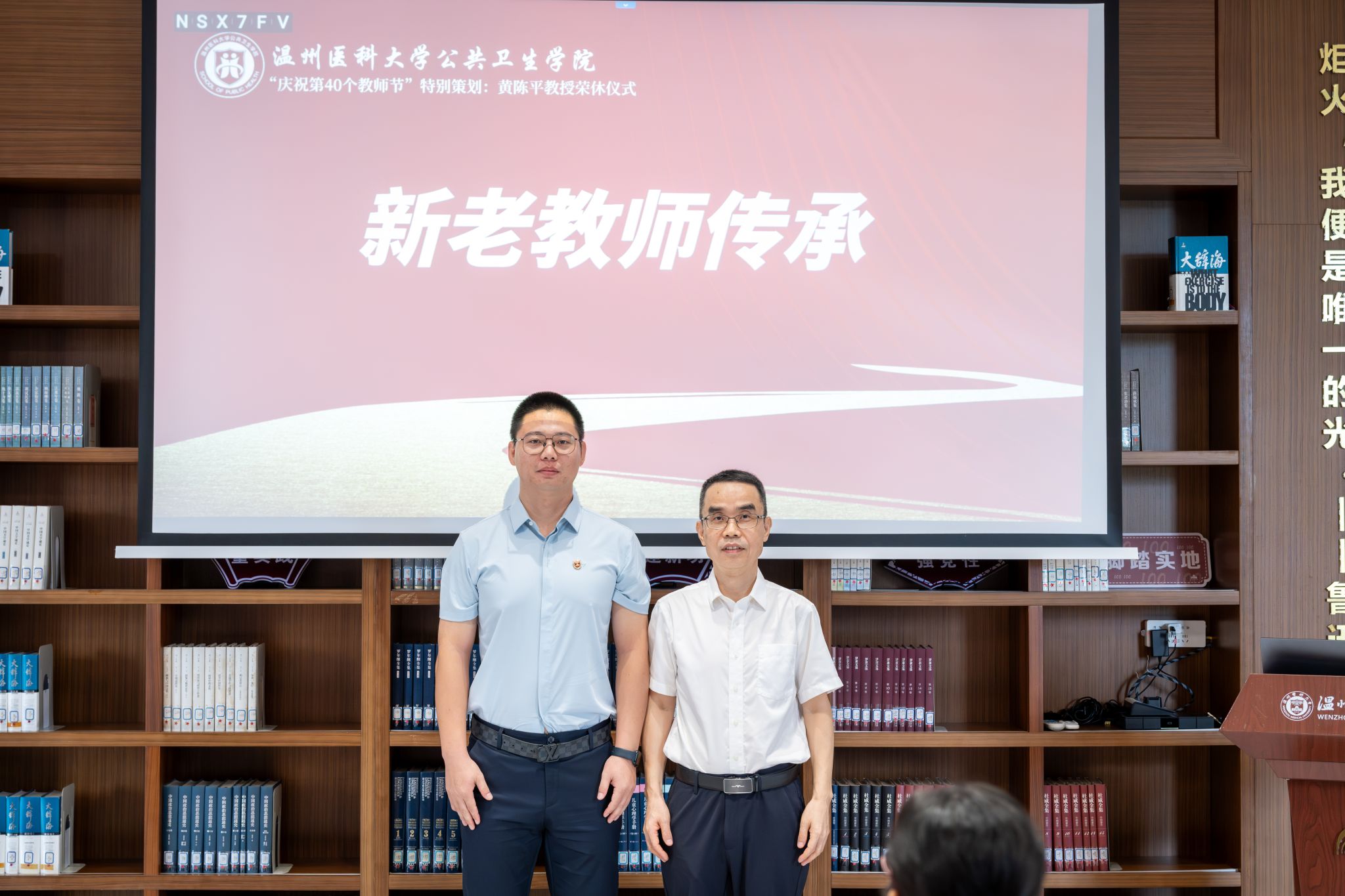 送往篇章结束,迎来篇章开启。活动之前,青年教师代表吴昊宇老师集齐了学院教工们写给黄陈平教授的纪念签名,活动现场黄教授亲自为吴老师佩戴校徽,新老教师的交接传承仪式感满满。