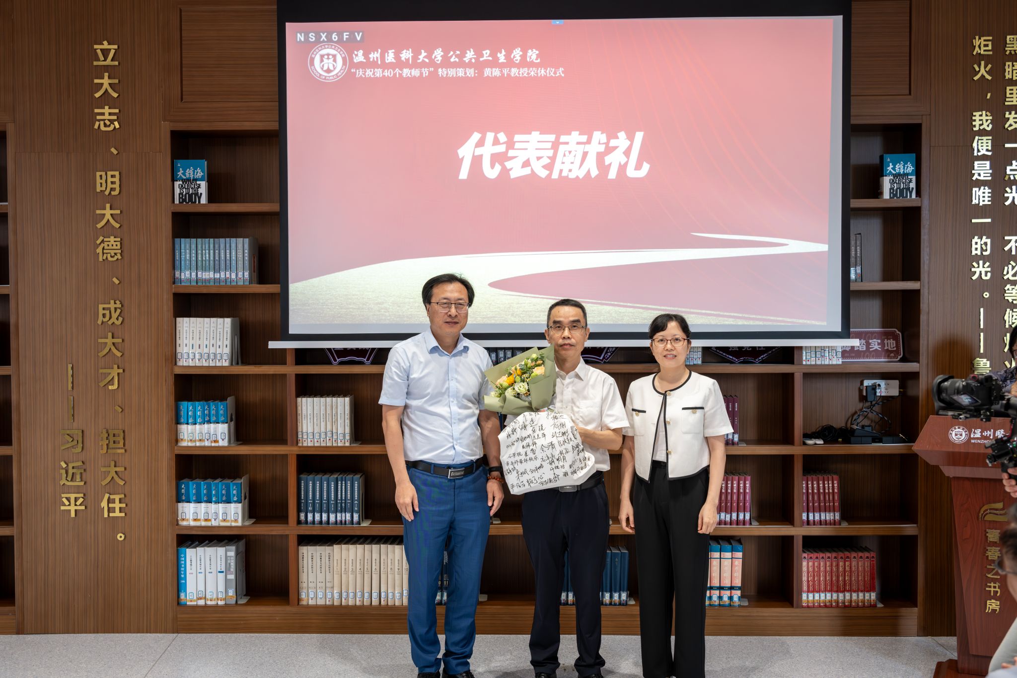 刘晓冬院长、王芳书记代表学院向黄陈平教授献上荣休祝福,感谢黄教授在学院建立和预防医学学科发展过程中作出的突出贡献,也希望黄教授退休后能够生活幸福、永远健康。