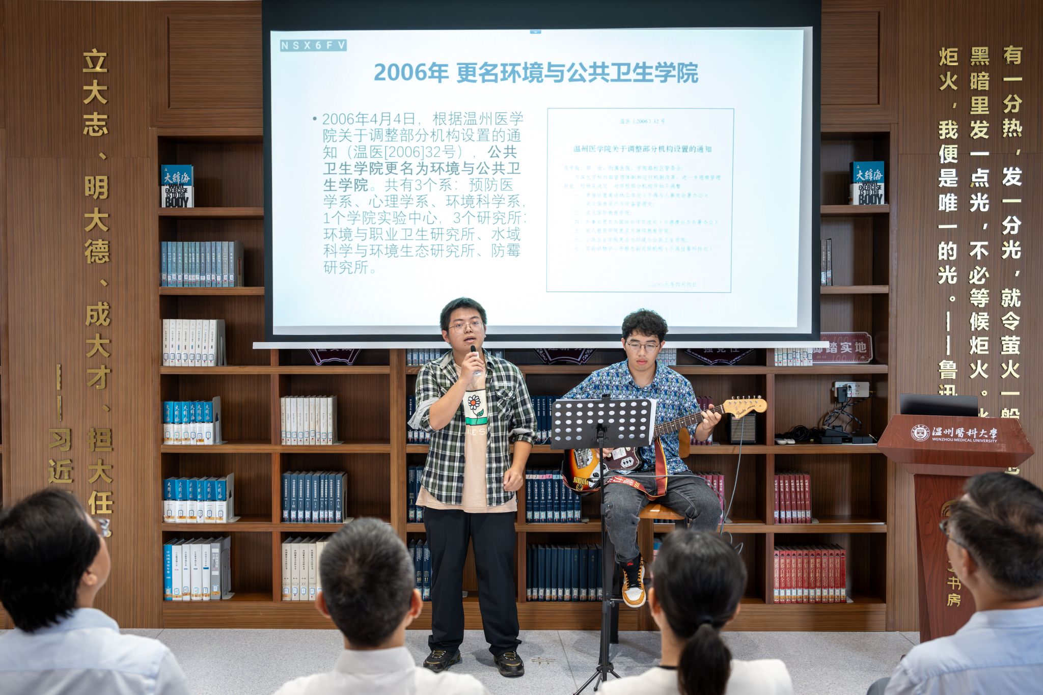 学院学生会和研究生会共同选送,由本科生代表王晨焕、徐健轩同学,研究生代表杨琴、任铉吉同学,分别献上吉他弹唱《光阴的故事》、诗歌朗诵《致老师》,“遥远的路程,昨日的梦,以及远去的笑声,再次的见面我们又历经了多少的路程。”歌声悠扬婉转,歌词触人心弦,将大家带回纯真而质朴的年代,成为共同的美好回忆。“希望黄教授,除了做老师,还可以做自己,拥有快乐、有趣、也平凡的日常!”同学们表达了诚挚温暖的祝福。