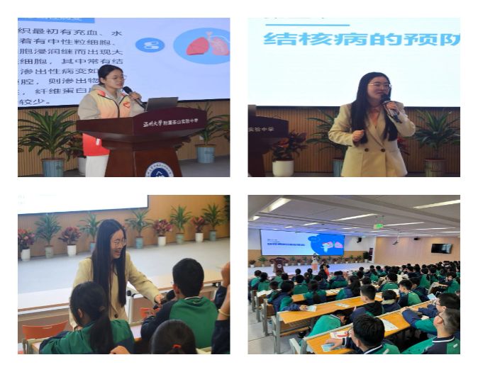 以第29个世界防治结核病日为契机,学院石芳老师和章红静同学为茶山实验中学近二百名师生做“预防肺结核科普知识”健康讲座,详细讲解结核病的基本知识、发病机制、治疗方法,普及疫苗接种的重要性,提高师生对结核病的认知和重视。此外,好色视频 各支部代表向在场的师生发放了健康宣讲手册,科普肺结核的相关知识。