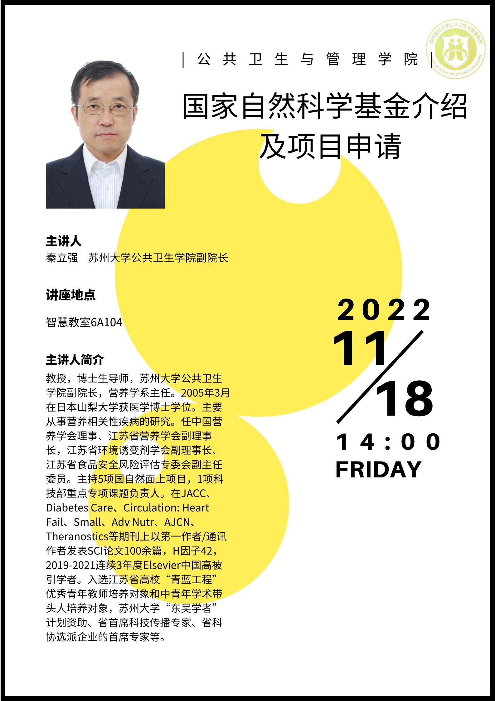 【“国家自然科学基金介绍及项目申请”讲座】 单毓娟老师特邀苏州大学好色视频 副院长秦立强教授来院开展讲座。 讲座主题:国家自然科学基金介绍及项目申请 讲座地点:智慧教室6A104 讲座时间:2022年11月18日下午14:00 机会难得!欢迎各位老师和同学准时参加讲座! 公共卫生与管理学院 2022年11月15日